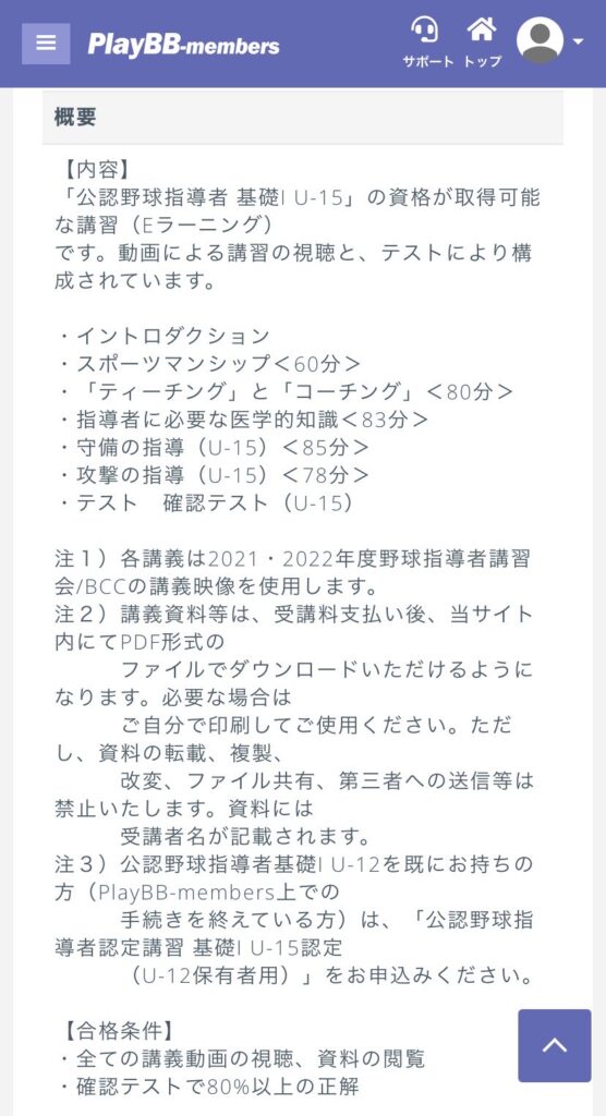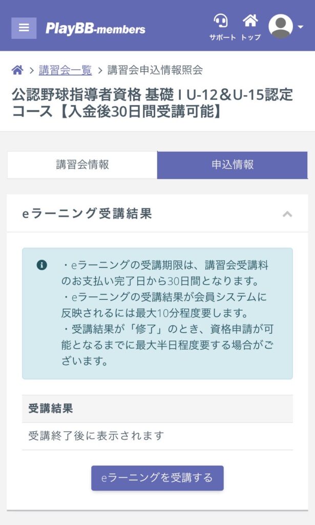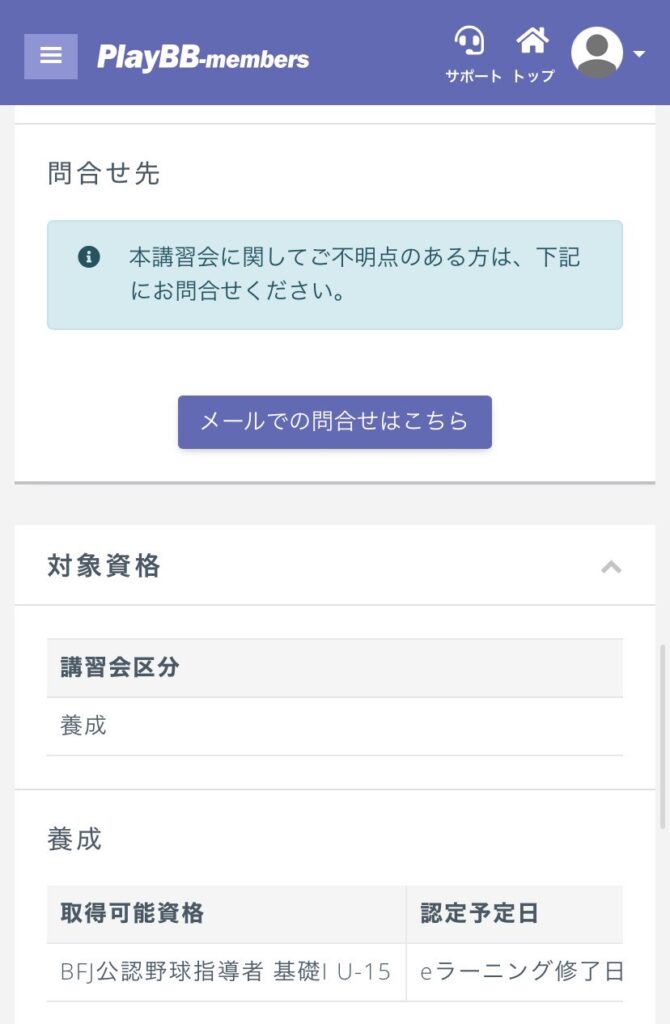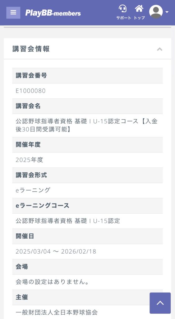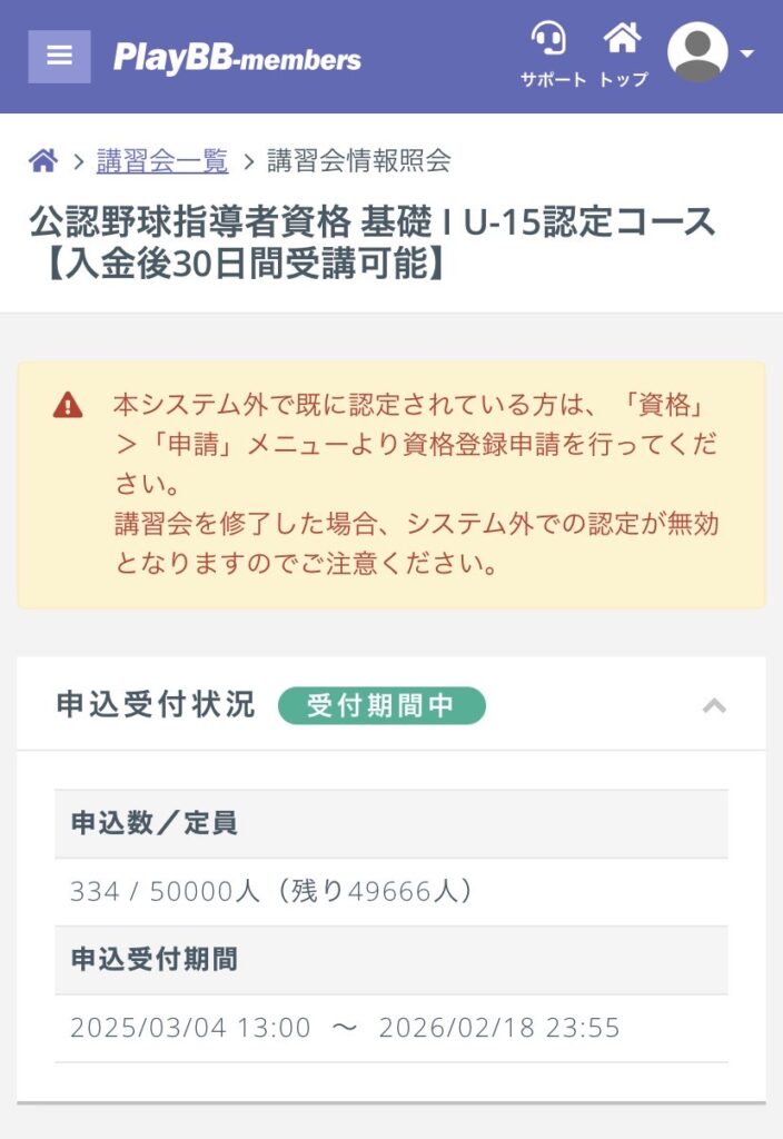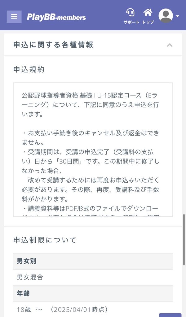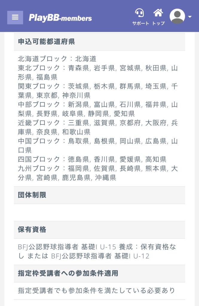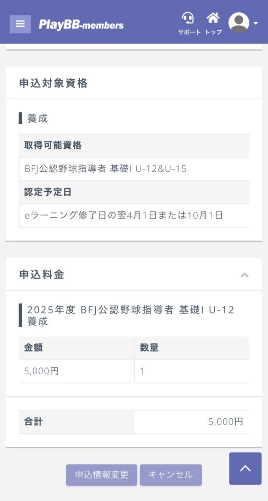▼野球指導者資格申込詳細画面